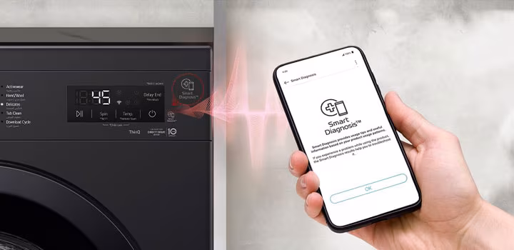 كما يمكنك التحكم الكامل بالغسالة عن بُعد عبر تطبيق LG ThinQ™ من خلال الواي فاي، لمتابعة التشغيل والتشخيص الذكي بسهولة.